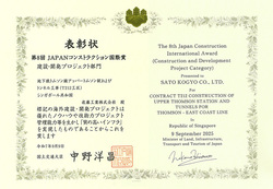 佐藤工業がシンガポールで施工した「地下鉄トムソン線アッパートムソン駅およびトンネル工事(T212工区)」が、国土交通省が主催する【第8回JAPANコンストラクション国際賞】(建設・開発プロジェクト部門)を受賞しました。