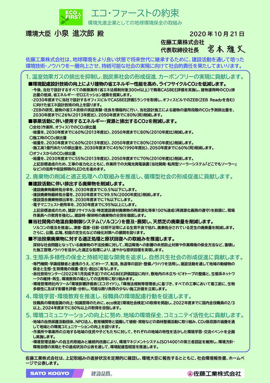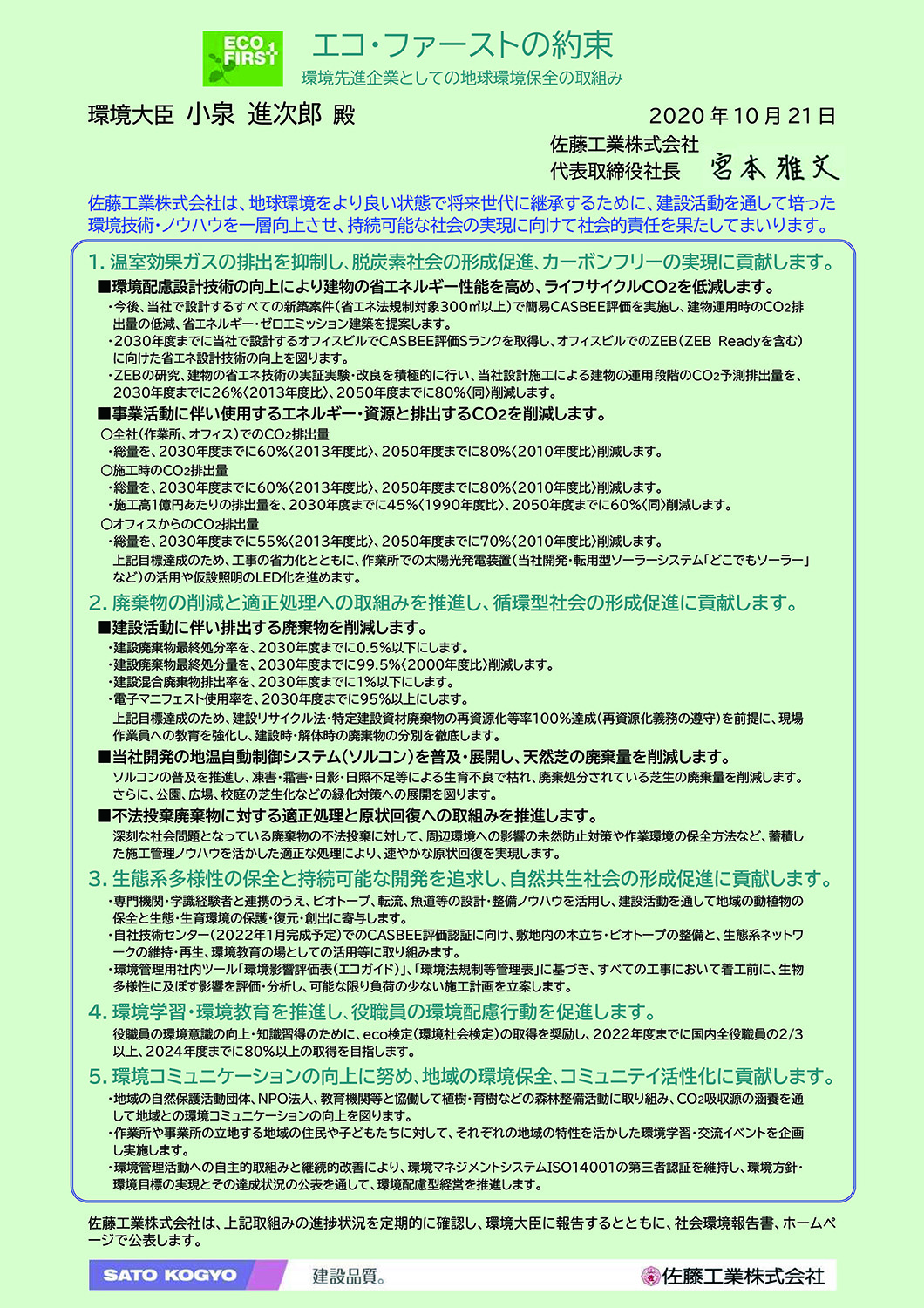 佐藤工業は、2020年10月21日に、環境大臣より『エコ・ファースト企業』の認定を受けました。